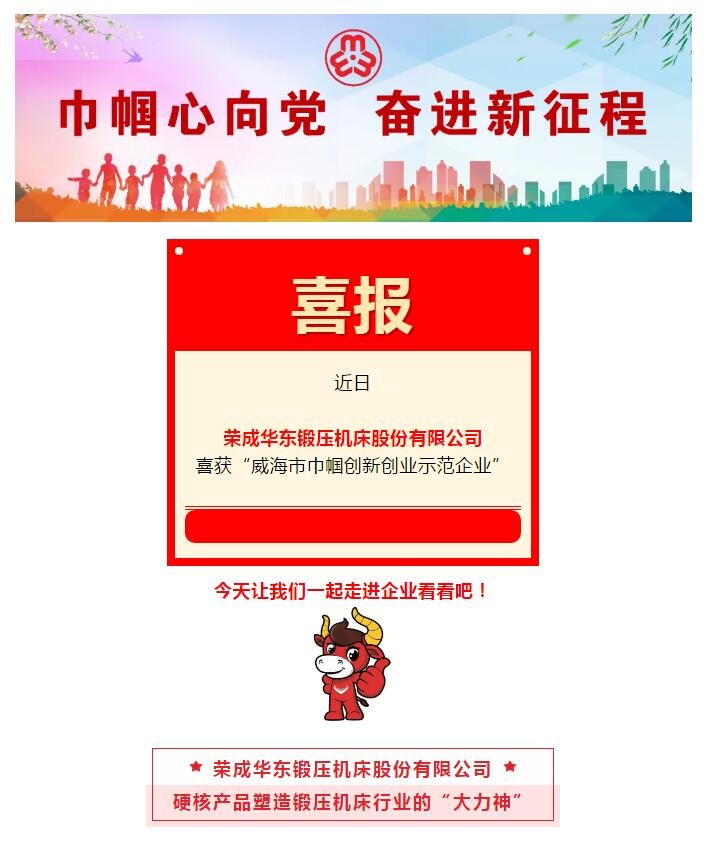 榮成華東鍛壓機(jī)床股份有限公司是裝備產(chǎn)業(yè)領(lǐng)域?qū)I(yè)從事機(jī)械壓力機(jī)及其自動(dòng)化生產(chǎn)線研制、生產(chǎn)、銷售的高新技術(shù)企業(yè),是全國(guó)鍛壓行業(yè)知名企業(yè),獲批山東省科技型中小企業(yè)、山東省技術(shù)創(chuàng)新示范企業(yè)、山東省“專精特新”中小企業(yè)等稱號(hào)。公司生產(chǎn)的“華鍛”圖片牌機(jī)械壓力機(jī)被授予山東省名牌、山東優(yōu)質(zhì)品牌產(chǎn)品。
